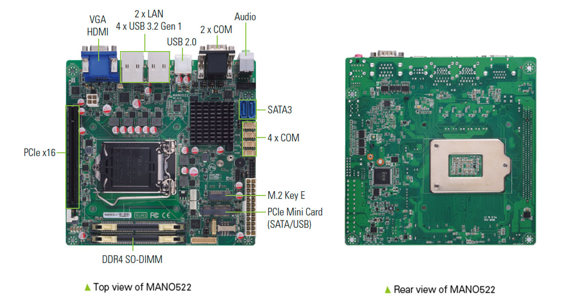 高效能工業級mini-ITX主機板MANO522支援2組260-pin最高達64GB的DDR4-2666/2400 SO-DIMM插槽記憶體,配備2組Intel®乙太網路控制器i211-AT與Intel®乙太網路連線i219-LM等Gigabit區域網路埠、1組高傳真音效編解碼器、4組高速USB 3.2 Gen1埠、2組USB 2.0埠、1組支援+5V/+12V的RS-232/422/485埠、5組RS-232埠、1組VGA埠、1組HDMI埠與1組LVDS埠等多元輸入/輸出介面。儲存介面包括2組SATA-600插槽,另配備1組PCIe x16與1組M.2 Key E插槽,方便連結Wi-Fi與藍牙等網路設備;並相容Windows® 10主流的作業系統。