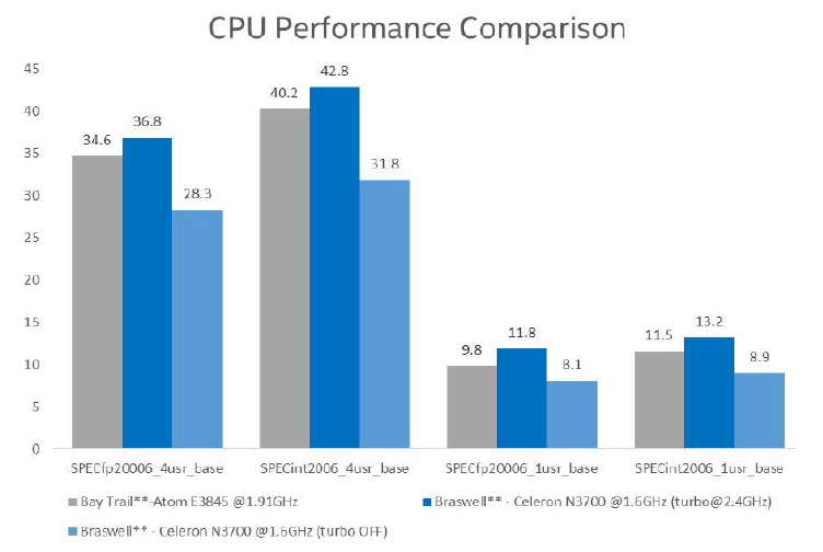 The power efficiency of the new 14nm process technology combines with improvements in its processor instructions to deliver faster performance in the latest Intel® Celeron® and Pentium® processors. These processors support up to four cores with Intel® Burst Technology2, which dynamically controls the performance and power of both the cores and graphics—boosting performance exactly where and when it is needed and saving energy when it counts. The following chart shows the comparison of CPU performance for Intel® Braswell versus previous generation platforms.