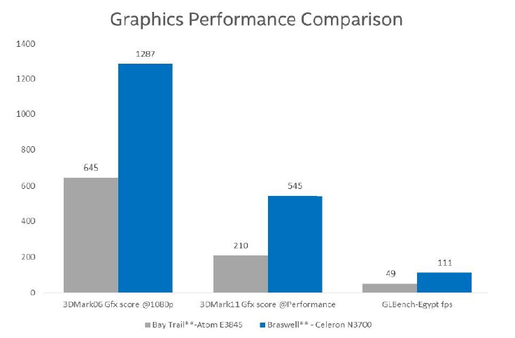 - Up to two times better graphics performance compared to previous generations through enhancements to the graphics architecture, additional execution units, enhanced codec decode support, and support for the latest graphics APIs. The chart below shows the comparison of graphics performance for Braswell vs. Bay Trail.
